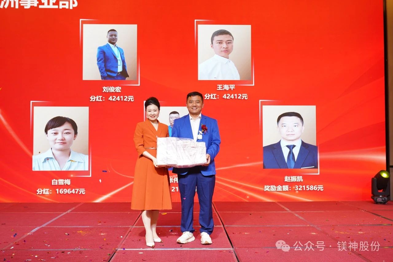 3月31日,河北鎂神科技股份有限公司2024年度總結(jié)暨表彰大會(huì)在邢臺(tái)市瑞爵酒店舉行,本次共發(fā)放獎(jiǎng)金1227.88萬(wàn)元!其中第四季度提成138.34萬(wàn)元、銅級(jí)榮休紀(jì)念獎(jiǎng)0.67萬(wàn)元、私欠清零4.3萬(wàn)元、評(píng)優(yōu)評(píng)模76.8萬(wàn)元、特殊貢獻(xiàn)獎(jiǎng)18萬(wàn)元、優(yōu)秀團(tuán)隊(duì)11萬(wàn)元、專(zhuān)項(xiàng)獎(jiǎng)金179.64萬(wàn)元、職能中心年終獎(jiǎng)72.84萬(wàn)元、利潤(rùn)中心分紅698.3萬(wàn)元、扎根非洲、熱愛(ài)非洲、建設(shè)非洲獎(jiǎng)28萬(wàn)。